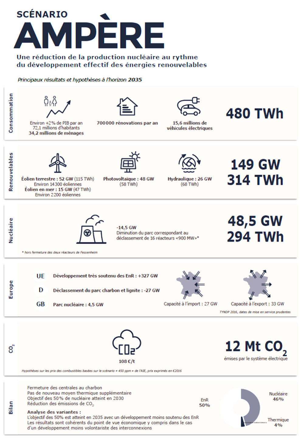 Ampère est le plus commenté des scénarios, notamment parce qu’il aboutit à une baisse des émissions de CO2 sans baisse de la consommation électrique des ménages français ; il prévoit une production d’électricité à 46 % nucléaire, 50 % renouvelable et 4 % fossile.