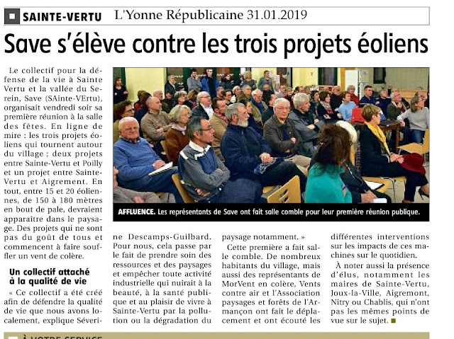 Extrait : Il (le maire) a évoqué le projet éolien et a souligné qu'il resterait vigilant avec l'association À contre vent, concernant l'appel du jugement du tribunal par le promoteur du projet, précisant : «Nous défendrons, aux côtés de l'association, le choix de la population qui s'est exprimée par référendum».